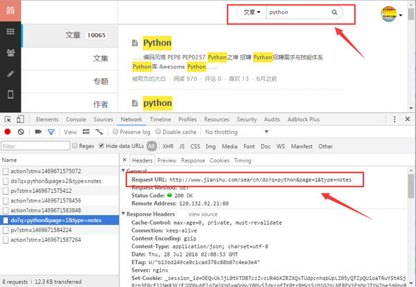 这是搜索时用到的 URL:http://www.jianshu.com/search/do?q=python&page=1&type=notes,q=python 表示搜索的关键字是 python,page 表示的是页数,但是在爬取时只能爬取前 100 页,每页 10 条数据,后面的文章请求不到,在浏览器中也无法查看。