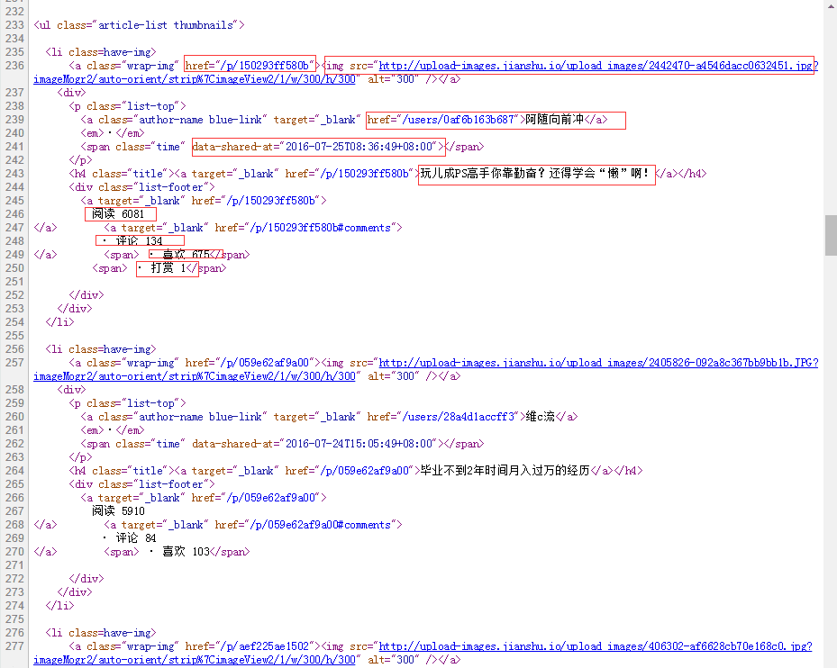 以下是简书首页文章处的源码: