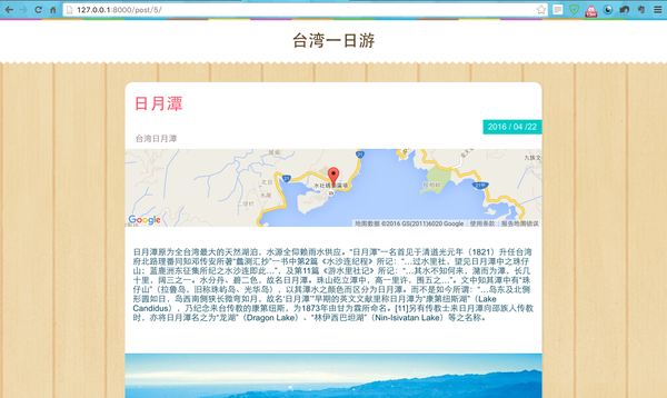 目前浏览文章的pk会传入view中,上面网址传入的pk为5(URL与pk的对应稍后设置,见本章第3节);当传入的pk=5,代表访客想浏览pk=5的那篇文章,利用ORM语法get,取得该片文章的Post对象:post = Post.objects.get(pk=pk),然后回传HttpResponse对象:将取得的post传入Template post.html,并呈现render后的结果。
