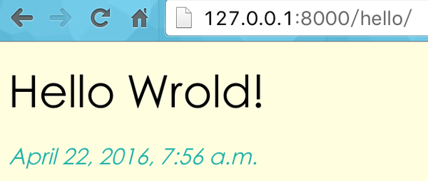 此时重新加载http://127.0.0.1:8000/hello/,发现时间与系统时间不一致,google后得知需要修改setting.py中的TIME_ZONE为\’Asia/Shanghai\’: