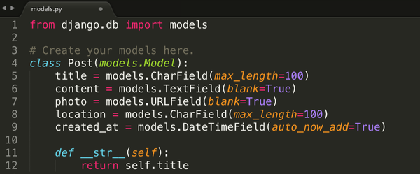 打开trips/models.py,创建一个Post类并定义属性,Django会依据这个类创建数据表以及表中的字段: