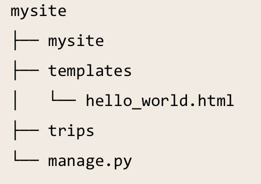 然后在templates文件夹中创建hello_world.html,并将之前写在view function中的HTML代码复制到hello_world.html,现在mysite文件夹目录结构如下: