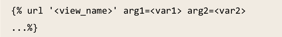 {% url %}:可以连接到特定view的template tag,语法是 {% url \'\’ %} ,根据在urls.py中的name值,找到对应的URL,也可以传入参数,如: