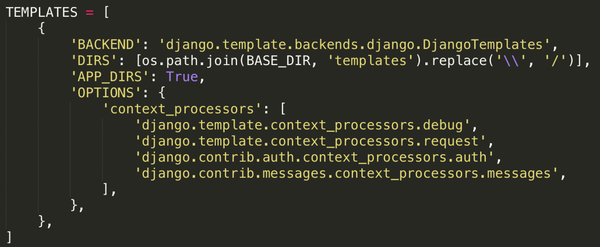 其次需要修改mysite文件夹中setting.py的TEMPLATES设置,将\’DIRS\’的[]修改为: