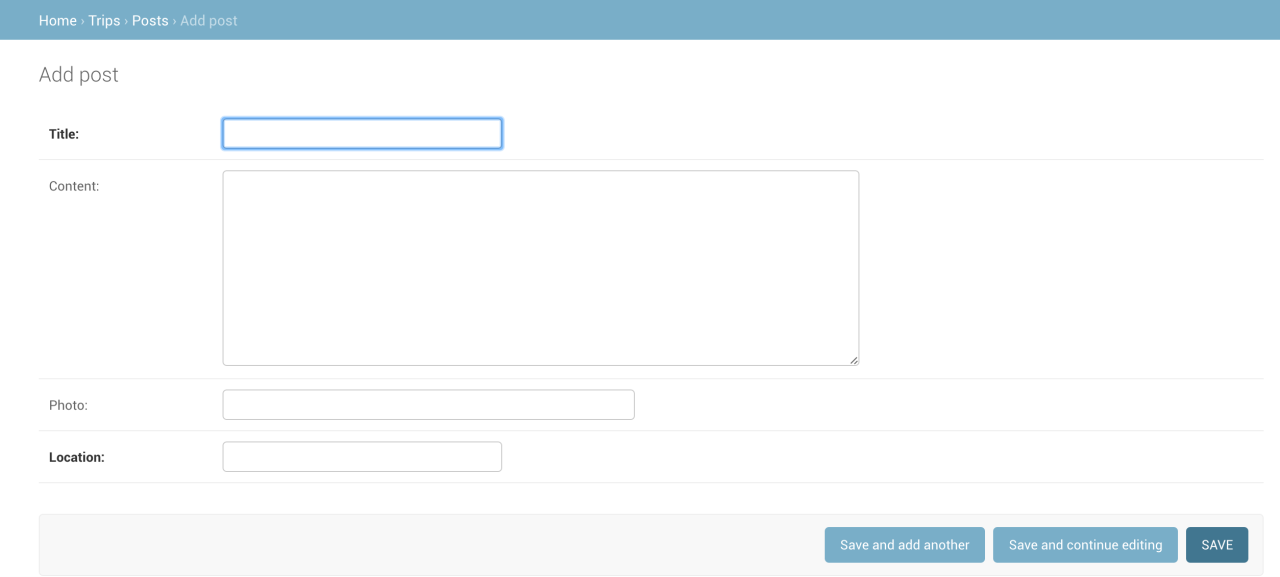 打开trips/models.py,创建一个Post类并定义属性,Django会依据这个类创建数据表以及表中的字段: