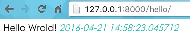 此时重新加载http://127.0.0.1:8000/hello/,发现时间与系统时间不一致,google后得知需要修改setting.py中的TIME_ZONE为\’Asia/Shanghai\’: