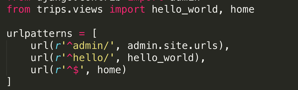 以上代码通过url() function 传入两个参数:regex和view,regex指定义的URL规则,regex用正则表达式(regular expression)来表示,r\’^hello/$\’表示的是hello/这种URL;view对应的是view function,此处指hello_world。