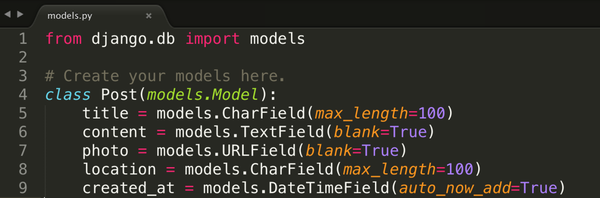 打开trips/models.py,创建一个Post类并定义属性,Django会依据这个类创建数据表以及表中的字段: