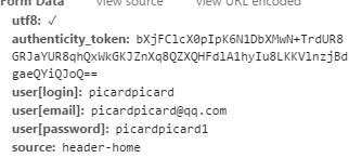 self.formdata = {\'utf-8\':\'✓\',\'authenticity_token\':token,\'user[login]\':login,\'user[email]\':email,\'user[password]\':password,\'source\':\'form-home\'}