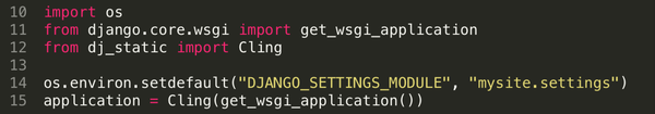 wsgi.py:WSGI是Python定义网页程序和服务器沟通的界面,为了让Heroku的服务能够通过这个界面与我们的网站沟通,修改mysite/mysite/wsgi.py如下: