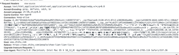 因为知乎是在线用户才能访问其他用户的关注列表和粉丝列表,所以基于此,我们必须伪装在线用户才能拿到数据。