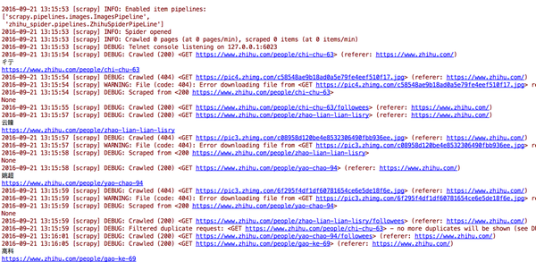 在命令行中通过 scrapy crawl zhihu 启动爬虫就可以爬取数据了