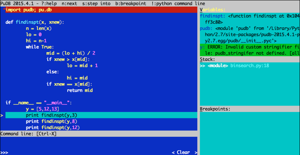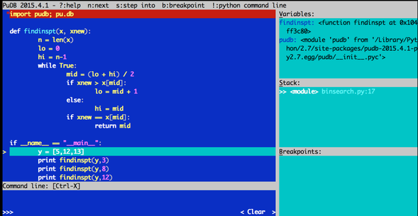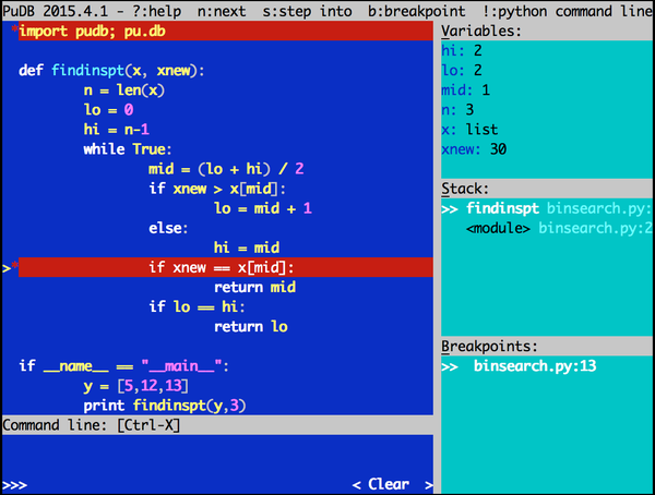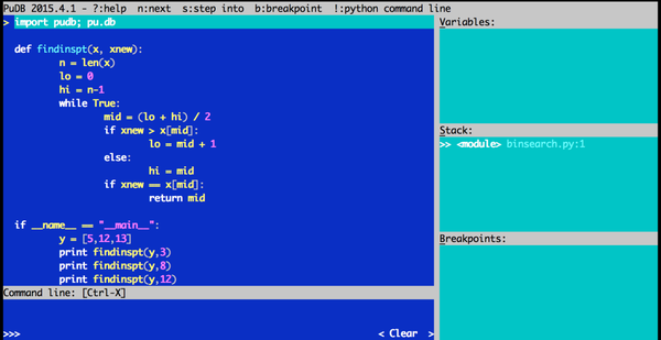 pudb是全屏的基于控制台的可视化调试器。如果你还记得Turbo C的话,看到这个你应该会感到亲切的。Homepage