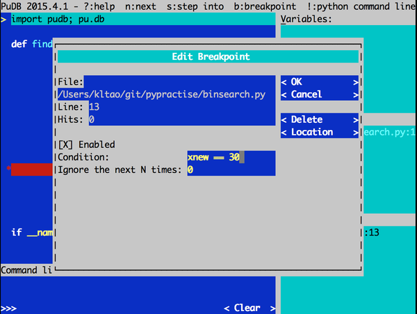 结果对于3,8,12都是对的,30的插入位置不对。为了让debug效率更高,下面使用断点功能。使用向下方向键,光标移动到第13行,按b即在该行设置了断点,右下角的断点显示窗口可以看到。