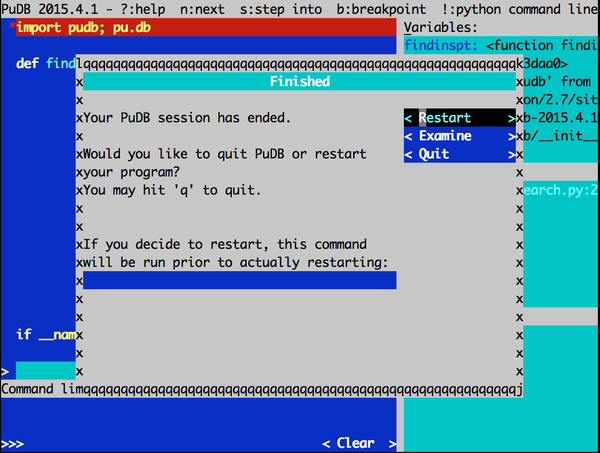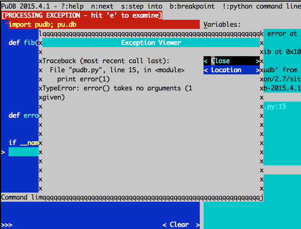 当光标停在函数上的时候可以选择n执行到下一行代码,或者s进入函数内部。正常如果有终端输出的时候,pudb会回到终端。但是我在mac上并没有回去,有待进一步验证。这个时候我们执行n的时候,如果函数有问题,会出现异常:[PROCESSING EXCEPTION – hit e to examine]。按e就会显示异常的具体信息。