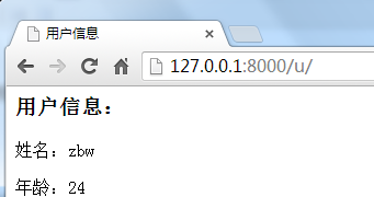 | 12345678910 | <html> <meta http–equiv=\”Content-type\” content=\”text/html; charset=utf-8\”> <title>用户信息</title> <head></head> <body> <h3>用户信息:</h3> <p>姓名:{{name}}</p> <p>年龄:{{age}}</p> </body></html> |