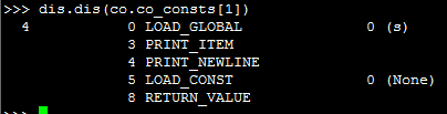 | 123456 | co.co_argcount 0co.co_nlocals 0co.co_names (‘s’, ’func’)co.co_varnames (‘s’, ’func’)co.co_consts (‘hello’, <code object func at 0x2aaeeec57110, file ”test.py”, line 3>, None)co.co_code ’d\\x00\\x00Z\\x00\\x00d\\x01\\x00\\x84\\x00\\x00Z\\x01\\x00e\\x01\\x00\\x83\\x00\\x00\\x01d\\x02\\x00S’ |