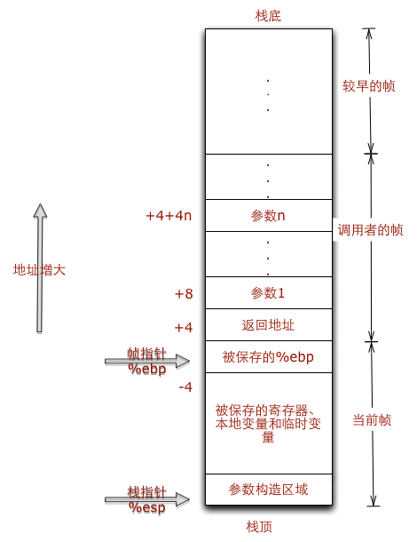 Python虚拟机的原理就是模拟可执行程序再X86机器上的运行,X86的运行时栈帧如下图:
