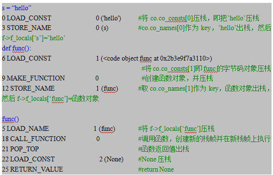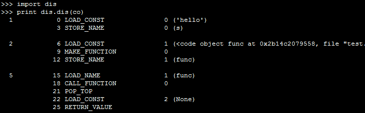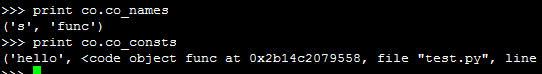 | 12 | co.co_names (‘s’, ’func’)co.co_consts (‘hello’, <code object func at 0x2aaeeec57110, file ”test.py”, line 3>, None) |