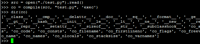在Python交互式shell里编译代码得到PyCodeObject对象: