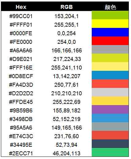 自定义颜色的色号,本文中使用的是Hex色号,下面给出了Hex和RGB的对应关系,以及相应的颜色。可以使用下面的Hex色号替换本文中图表的颜色。