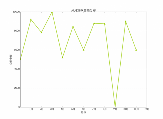 #设置日期字段issue_d为loandata数据表索引字段 loandata = loandata.set_index(\'issue_d\') #按月对贷款金额loan_amnt求均值,以0填充空值 loan_plot=loandata[\'loan_amnt\'].resample(\'M\').fillna(0) #图表字体为华文细黑,字号为15 plt.rc(\'font\', family=\'STXihei\', size=15) #创建一个一维数组赋值给a a=np.array([1,2,3,4,5,6,7,8,9,10,11,12]) #创建折线图,数据源为按月贷款均值,标记点,标记线样式,线条宽度,标记点颜色和透明度 plt.plot(loan_plot,\'g^\',loan_plot,\'g-\',color=\'#99CC01\',linewidth=3,markeredgewidth=3,markeredgecolor=\'#99CC01\',alpha=0.8) #添加x轴标签 plt.xlabel(\'月份\') #添加y周标签 plt.ylabel(\'贷款金额\') #添加图表标题 plt.title(\'分月贷款金额分布\') #添加图表网格线,设置网格线颜色,线形,宽度和透明度 plt.grid( color=\'#95a5a6\',linestyle=\'--\', linewidth=1 ,axis=\'y\',alpha=0.4) #设置数据分类名称 plt.xticks(a, (\'1月\',\'2月\',\'3月\',\'4月\',\'5月\',\'6月\',\'7月\',\'8月\',\'9月\',\'10月\',\'11月\',\'12月\') ) #输出图表 plt.show()