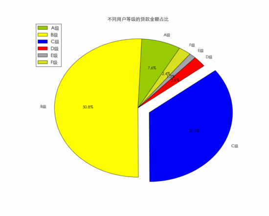 #图表字体为华文细黑,字号为15 plt.rc(\'font\', family=\'STXihei\', size=15) #设置饼图中每个数据分类的颜色 colors = [\"#99CC01\",\"#FFFF01\",\"#0000FE\",\"#FE0000\",\"#A6A6A6\",\"#D9E021\"] #设置饼图中每个数据分类的名称 name=[\'A级\', \'B级\', \'C级\', \'D级\', \'E级\',\'F级\'] #创建饼图,设置分类标签,颜色和图表起始位置等 plt.pie(loan_grade,labels=name,colors=colors,explode=(0, 0, 0.15, 0, 0, 0),startangle=60,autopct=\'%1.1f%%\') #添加图表标题 plt.title(\'不同用户等级的贷款金额占比\') #添加图例,并设置显示位置 plt.legend([\'A级\',\'B级\',\'C级\',\'D级\',\'E级\',\'F级\'], loc=\'upper left\') #显示图表 plt.show()