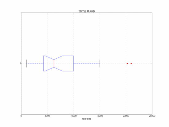 #图表字体为华文细黑,字号为15 plt.rc(\'font\', family=\'STXihei\', size=15) #创建箱线图,数据源为贷款来源,设置横向显示 plt.boxplot(loandata[\'loan_amnt\'],1,\'rs\',vert=False) #添加x轴标题 plt.xlabel(\'贷款金额\') #添加图表标题 plt.title(\'贷款金额分布\') #设置背景网格线的颜色,样式,尺寸和透明度 plt.grid(color=\'#95a5a6\',linestyle=\'--\', linewidth=1,axis=\'both\',alpha=0.4) #显示图表 plt.show()