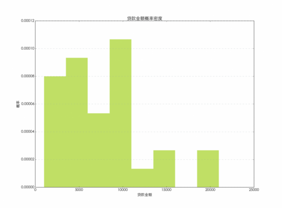 #图表字体为华文细黑,字号为15 plt.rc(\'font\', family=\'STXihei\', size=15) #创建直方图,数据源为贷款金额,将数据分为8等份显示,设置颜色和显示方式,透明度等 plt.hist(loandata[\'loan_amnt\'],8,normed=1, histtype=\'stepfilled\',facecolor=\'#99CC01\', rwidth=0.9,alpha=0.6,edgecolor=\'white\') #添加x轴标题 plt.xlabel(\'贷款金额\') #添加y轴标题 plt.ylabel(\'概率\') #添加图表标题 plt.title(\'贷款金额概率密度\') #设置背景网格线的颜色,样式,尺寸和透明度 plt.grid(color=\'#95a5a6\',linestyle=\'--\', linewidth=1,axis=\'y\',alpha=0.4) #显示图表 plt.show()