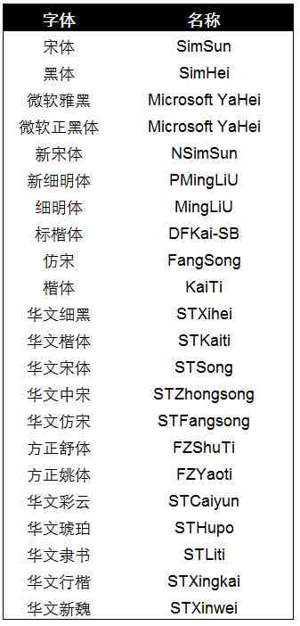 图表中所使用的字体,可以使用下面的字体名称替换family=后面的内容以改变图表中所显示的字体。
