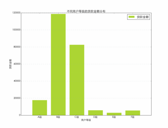 #按用户等级grade字段对贷款金额进行求和汇总 loan_grade=loandata.groupby(\'grade\')[\'loan_amnt\'].agg(sum) #图表字体为华文细黑,字号为15 plt.rc(\'font\', family=\'STXihei\', size=15) #创建一个一维数组赋值给a a=np.array([1,2,3,4,5,6]) #创建柱状图,数据源为按用户等级汇总的贷款金额,设置颜色,透明度和外边框颜色 plt.bar([1,2,3,4,5,6],loan_grade,color=\'#99CC01\',alpha=0.8,align=\'center\',edgecolor=\'white\') #设置x轴标签 plt.xlabel(\'用户等级\') #设置y周标签 plt.ylabel(\'贷款金额\') #设置图表标题 plt.title(\'不同用户等级的贷款金额分布\') #设置图例的文字和在图表中的位置 plt.legend([\'贷款金额\'], loc=\'upper right\') #设置背景网格线的颜色,样式,尺寸和透明度 plt.grid(color=\'#95a5a6\',linestyle=\'--\', linewidth=1,axis=\'y\',alpha=0.4) #设置数据分类名称 plt.xticks(a,(\'A级\',\'B级\',\'C级\',\'D级\',\'E级\',\'F级\')) #显示图表 plt.show()
