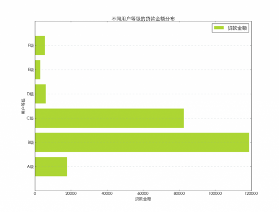 #图表字体为华文细黑,字号为15 plt.rc(\'font\', family=\'STXihei\', size=15) #创建一个一维数组赋值给a a=np.array([1,2,3,4,5,6]) #创建条形图,数据源为分等级贷款金额汇总,设置颜色,透明度和图表边框 plt.barh([1,2,3,4,5,6],loan_grade,color=\'#99CC01\',alpha=0.8,align=\'center\',edgecolor=\'white\') #添加x轴标题 plt.xlabel(\'贷款金额\') #添加y轴标题 plt.ylabel(\'用户等级\') #添加图表标题 plt.title(\'不同用户等级的贷款金额分布\') #添加图例,并设置在图表中的显示位置 plt.legend([\'贷款金额\'], loc=\'upper right\') #设置背景网格线的颜色,样式,尺寸和透明度 plt.grid(color=\'#95a5a6\',linestyle=\'--\', linewidth=1,axis=\'y\',alpha=0.4) #设置数据分类名称 plt.yticks(a,(\'A级\',\'B级\',\'C级\',\'D级\',\'E级\',\'F级\')) #显示图表 plt.show()