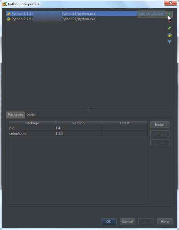 增加之后PyCharm会智能地提示你安装setuptool和pip,照着提示一路点击就行了。(Python2.7的setuptool安装会报错UnicodeDecodeError: \’ascii\’ codec can\’t decode byte 0xc4 in position 33: ordinal not in range(128),需要手工修改脚本再安装,详情)。