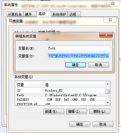 将python的安装路径添加到最后,记得先加一个分号以分隔,如: ;C:\\Python27,然后点击“确定”
