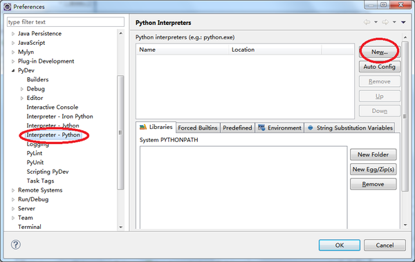 4.3 在弹出的对话框中选择PyDev –> Interpreter – Python,点击按钮”New…“