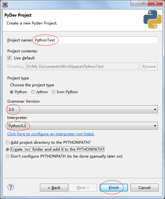 5.3 填入Project Name,选择Grammar Version –> 3.0,选择Interpreter –> Python3.3,点Finish