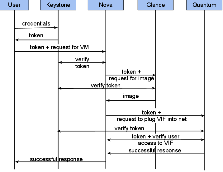 1. 用户想要创建一个服务器。首先用户要提供自己的认证信息(可能是用户名和密码,或者是用户名和API key),然后keystone提供一个临时的token和一个服务列表(serviceCatalog)