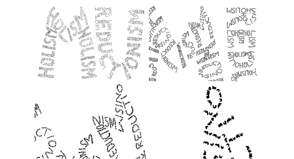 这幅图取自 Douglas Hofstadter 的著作Gödel, Escher, Bach。图中的每一个字母都由其他更小的字母组成。在最高层级,我们看的是\”MU\”,M 这个字母由三个HOLISM(整全觀)构成,U则是由一个REDUCTIONISM(还原论)构成,前者的每一个字母都包含后者的后者整个词,反之亦然。而在最低层级,你会发现最小的字母又是由重复的\”MU\”组成的。