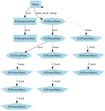 在看怎么执行之前,先要简单的说明一下python的运行时环境初始化。python中有一个解释器状态对象PyInterpreterState用于模拟进程(后面简称进程对象),另外有一个线程状态对象PyThreadState模拟线程(后面简称线程对象)。python中的PyInterpreterState结构通过一个链表链接起来,用于模拟操作系统多进程。进程对象中有一个指针指向线程集合,线程对象则有一个指针指向其对应的进程对象,这样线程和进程就关联了起来。当然,还少不了一个当前运行线程对象_PyThreadState_Current用来维护当前运行的线程。