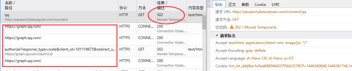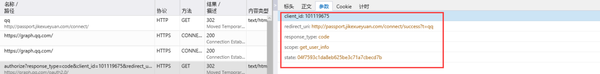 这里有一个HTTP 302跳转至`https://graph.qq.com/oauth2.0/authorize`,用于获取\’Authorization Code\'(请参考`http://open.qq.com/`说明)