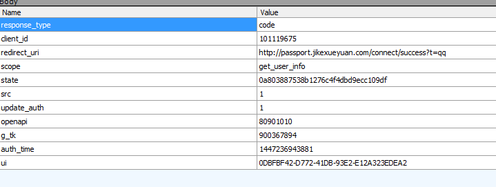 fiddler抓日志看的话,可以看到,就是学院的通行证使用QQ登录模块,向腾讯请求认证,主要包含cliet_id和state,redirect_uri为本网站。