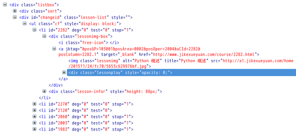 在lession-box的div块内可以看到课程《python概述》的地址为:http://www.jikexueyuan.com/course/2282.html