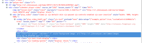 直到此才浏览到真正课程播放视频的页面,之前说过,学院播放使用的video-js实现的视频控制,视频地址可以从source项查询到,我们看播放器HTML内容: