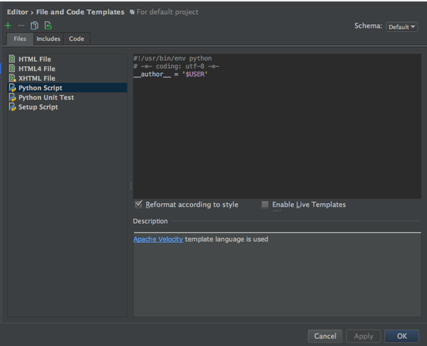 依次点击:File->Default Settings->Editor->File and Code Templete -> Python Script