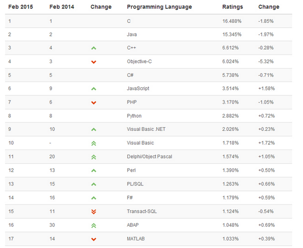 JavaScript不断走强。本月它超过了php,现在的位置排名第六。另外,Objective-C的日子似乎已经结束。一年时间,Objective-C份额下降超过5%。现在排到第四的位置,在C++之后。Objective-C之前排在第三位的位置长达超过2.5年。