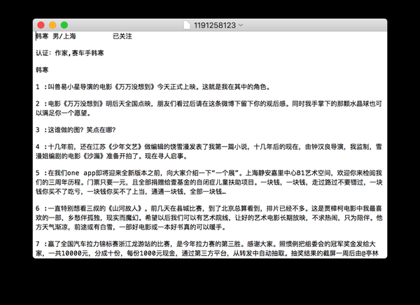 print u\'原创微博爬取完毕,共%d条,保存路径%s\'%(word_count-4,word_path)