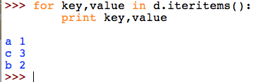 默认情况下,dict迭代的是key。如果要迭代value,可以用for value in d.itervalues(),如果要同时迭代key和value,可以用for k, v in d.iteritems()。